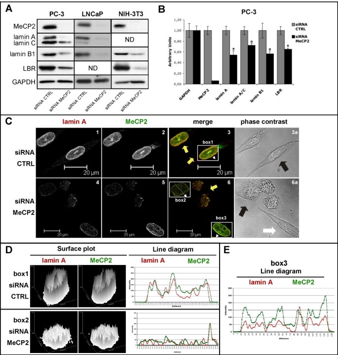 方法细节:在PC-3、LNCaP、NIH-3T3细胞中,MeCP2敲低后5、7天采用Western blot检测lamin A/C、lamin B1、LBR的蛋白表达水平,通过RT-qPCR检测其mRNA水平;转染7天后采用免疫荧光结合共聚焦显微镜观察lamin A的定位及核膜形态,分析蛋白表达的荧光强度分布,实验独立重复3次。