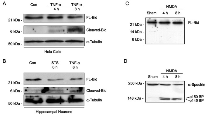 实验目的:确认谷氨酸受体过度激活诱导的兴奋性毒性中,Bid是否经caspase-8切割激活。方法细节:以HeLa D98细胞和原代培养大鼠海马神经元为模型,分别用肿瘤坏死因子-α/环己酰亚胺(TNF-α/CHX)、星形孢菌素(STS)作为阳性对照,用300μM NMDA处理海马神经元5分钟,在处理后4h、8h提取细胞总蛋白,采用免疫印迹法检测Bid的切割产物,同时检测钙蛋白酶底物α-spectrin的切割情况以验证NMDA处理的有效性。结果解读:免疫印迹结果显示,阳性对照处理组可检测到FL-Bid的切割产物,而NMDA处理组未检测到FL-Bid含量减少或切割产物生成,但α-spectrin被切割为150kDa和145kDa的钙蛋白酶特异性产物,说明NMDA处理后钙蛋白酶激活,但Bid未发生显著切割(n=4,重复实验结果一致)。