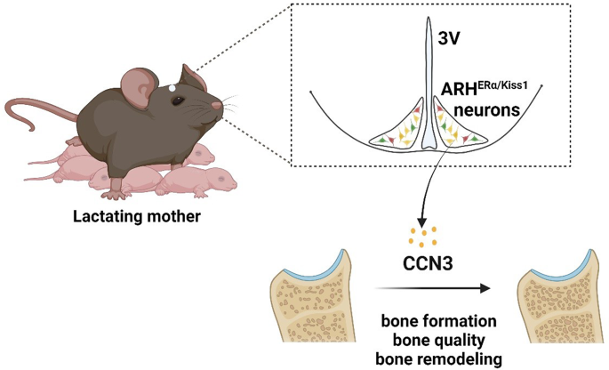 本研究针对这一核心空白,通过多组学、动物模型、细胞实验等多种技术手段,首次发现下丘脑弓状核(ARH)中ARH^{ERα/Kiss1}神经元来源的细胞通讯网络因子3(CCN3)作为成骨激素,在哺乳期特异性表达并维持骨形成,为哺乳期骨骼代谢调控提供了全新的脑-骨轴机制。