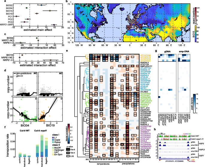 结果解读:GLM分析显示,降水季节性(BIO15)和昼夜温差(BIO02)解释了9%的转座子活性变异,NRPE1与温度季节性(BIO04)、最冷季降水(BIO19)存在显著交互作用(P<0.01);Mantel分析发现57个TE家族与至少一个气候变量关联,其中ATCOPIA78等COPIA家族与温度变量显著关联;实验室热激处理下,nrpd1突变体的转座子活性显著高于野生型,涉及GYPSY和MuDR家族;DAP-seq分析显示,温度响应TE家族的LTR区域存在热响应元件,热激因子(HSFs)可结合这些区域,且DNA甲基化抑制其结合。