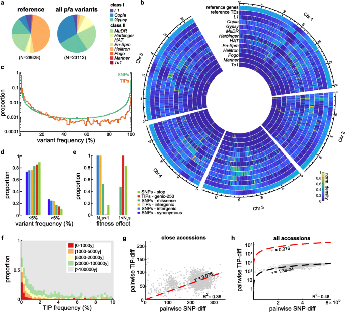 结果解读:转座子插入的突变率约为0.076±0.0012每基因组每世代,接近碱基替换率的1/3;超过99%的基因附近(250bp内)转座子插入具有有害效应(Nₑs>1),显著高于错义突变(48%)和无义突变(83%);低频率TIPs(<1.5%)中约一半为5000年以内的近期转座事件,反映自然选择对有害转座子插入的快速清除。