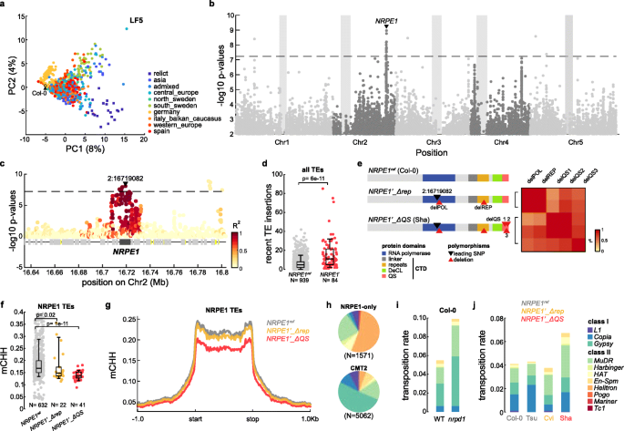 结果解读:GWAS分析鉴定到NRPE1为调控转座子转座的关键基因,其非参考等位基因NRPE1"(存在截短突变ΔQS和Δrep)与转座子活性显著关联,携带NRPE1"的材料转座子活性比参考等位基因材料提高240%(P<0.001);实验室nrpd1突变体的转座子插入数量比野生型增加80%,自然材料Sha的转座率最高,主要由GYPSY和MuDR家族贡献,验证了NRPE1对RdDM靶向转座子的调控作用。
