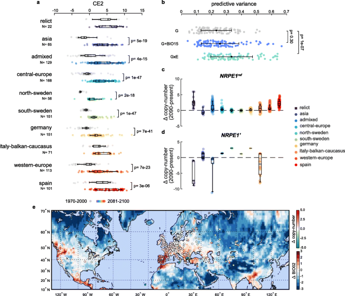 结果解读:模型预测显示,未来地中海地区的转座子转座活性将显著增加;携带NRPE1参考等位基因的材料在大部分地区转座活性升高,而携带NRPE1"等位基因的材料在意大利南部、巴尔干半岛等地区转座活性降低,在瑞典等高纬度地区转座活性升高,表明遗传与环境的交互作用将显著影响未来转座子的活性分布。