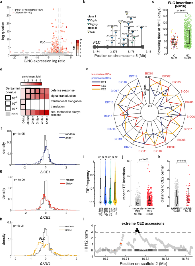 结果解读:超过50%的低频率转座子插入位于基因内,其中外显子插入主要由COPIA家族贡献,约75%的外显子插入关联基因表达显著下调(n=604,P<0.05);GO富集分析显示,转座子插入靶向的基因显著富集于防御响应、环境刺激响应等功能类别;137个基因的转座子插入与气候包络显著关联(FDR校正P<0.05),其中FLC基因的16个转座子插入与开花时间提前关联,在温和冬季地区频率更高(Wilcoxon检验P<0.001);iHH12分析显示,NRPE1"等位基因在极端CE2环境(炎热干燥夏季)中存在软选择清除信号,其iHH12值高于基因组99%阈值。