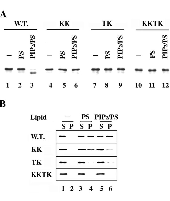 实验结果显示,蛋白水解实验中,三种突变体均不受PIP₂/PS混合囊泡的诱导降解(对应图5A);囊泡共沉淀实验中,KK突变体与PS囊泡的结合能力略有下降,与PIP₂/PS囊泡的结合能力显著降低;TK突变体完全丧失与PS囊泡的结合能力,仅能微弱结合PIP₂/PS囊泡;KKTK突变体则完全丧失与两种囊泡的结合能力(对应图5B)。免疫印迹结果显示,三种突变体的蛋白表达水平与野生型Boi1相当(对应图7A),说明突变体的功能缺陷并非由蛋白稳定性下降导致。上述结果证实,所构建的突变体均存在不同程度的磷脂结合能力缺陷,其中KK突变主要影响PIP₂结合,TK突变主要影响PS结合,KKTK突变则完全丧失磷脂结合能力。