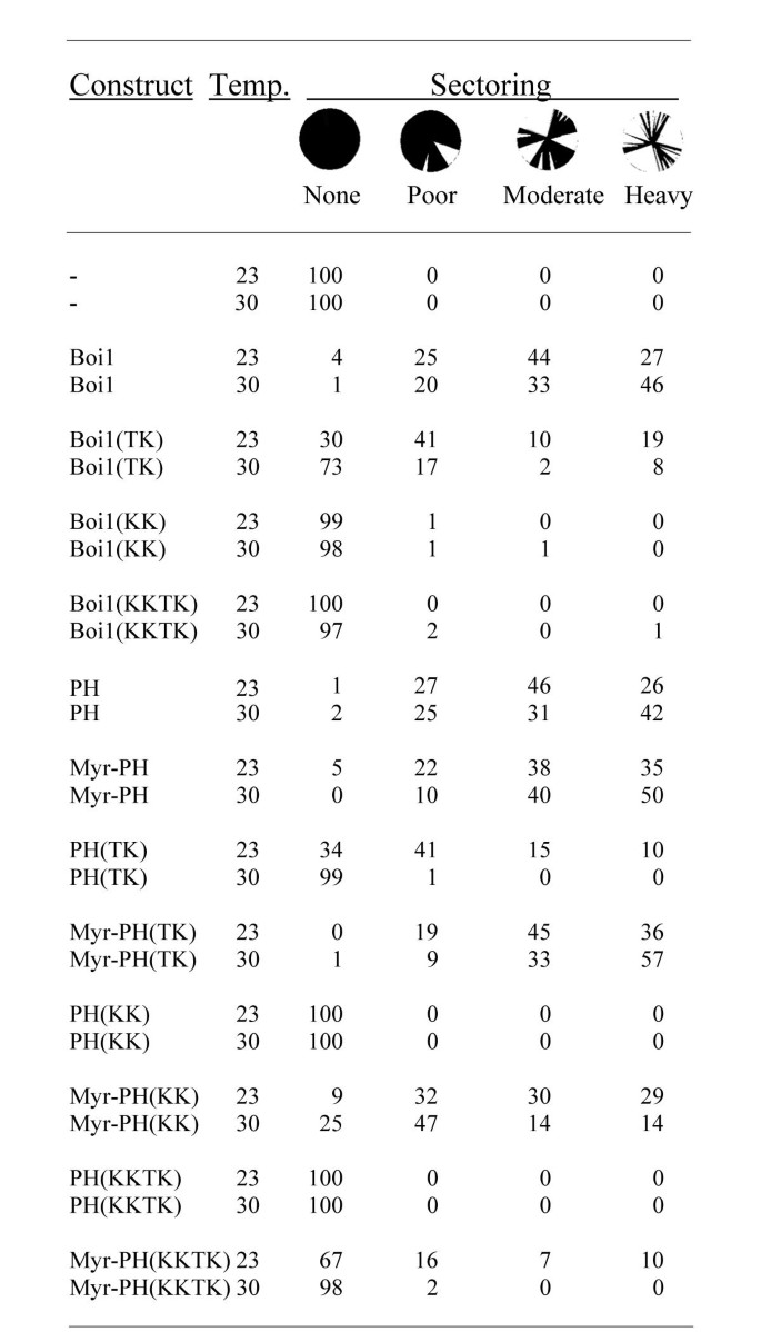 实验结果显示,野生型Boi1在23℃与30℃分别有71%、79%的菌落呈现中度或重度扇区(n=200);TK突变体Boi1的扇区比例显著降低,23℃仅29%、30℃仅10%的菌落呈现中度或重度扇区;KK与KKTK突变体则几乎无扇区形成,说明其功能完全丧失(对应图6)。Myr融合标签可显著恢复突变体的功能:Myr-Boi1-PH(TK)在23℃有81%、30℃有90%的菌落呈现中度或重度扇区;Myr-Boi1-PH(KK)在23℃有59%、30℃有28%的菌落呈现中度或重度扇区;Myr-Boi1-PH(KKTK)仅在23℃有17%的菌落呈现中度或重度扇区(对应图6)。免疫印迹结果显示,Myr融合不影响突变体蛋白的表达水平(对应图7B)。上述结果表明,磷脂结合对Boi1功能至关重要,PS结合主要负责将Boi1招募至细胞膜,而PIP₂结合除膜定位外还参与额外的功能调控。