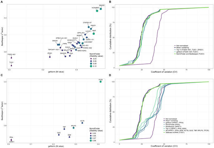 结果解读:均值中心化作为金标准方法实现了最大程度的表达变异消减,而仅使用牛磺酸上调基因1单一内参进行标准化的变异消减效果与均值中心化相当,且显著优于所有其他测试的标准化策略,包括多个长链非编码RNA内参的组合、所有信使RNA内参相关的标准化策略。对应结果展示为图1的累积分布曲线,其中图B为不同长链非编码RNA标准化策略的变异系数累积分布,图D为包含信使RNA标准化策略的变异系数累积分布。文献未提及具体实验产品,领域常规使用相关统计分析软件完成数据处理与可视化。