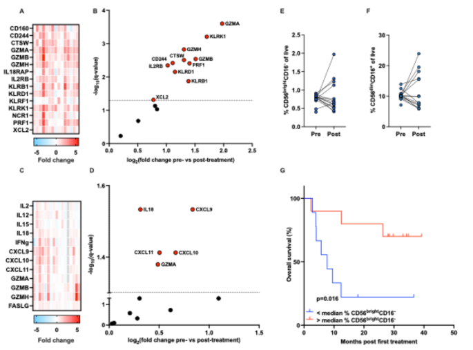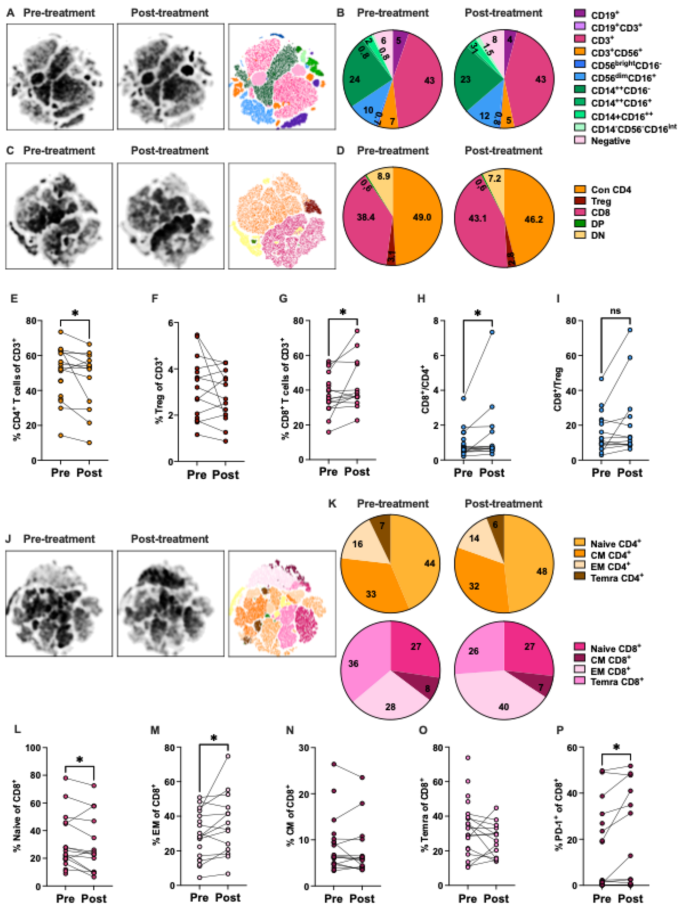 结果显示,治疗后外周血中常规CD4+T细胞、调节性T细胞频率显著降低,CD8+T细胞频率显著升高,CD8+/CD4+T细胞比值、CD8+/调节性T细胞比值显著升高(P<0.05,n=14);CD8+T细胞中,初始亚群频率降低,效应记忆(effector memory,EM)亚群频率升高,PD-1表达上调(P<0.05,n=14);外周树突状细胞样细胞(CD14-HLA-DR+)的CD40表达显著升高(P<0.05,n=14);自然杀伤细胞亚群频率无显著变化,但基线CD56brightCD16-自然杀伤细胞频率高于中位数的患者总生存期更长(P<0.05,Log-rank检验);治疗后9周循环单核系髓系来源抑制细胞(CD14+HLA-DRlow)频率高于中位数的患者总生存期更短(P<0.05,Log-rank检验)。对应结果图为流式tSNE图、细胞频率变化散点图、生存曲线: