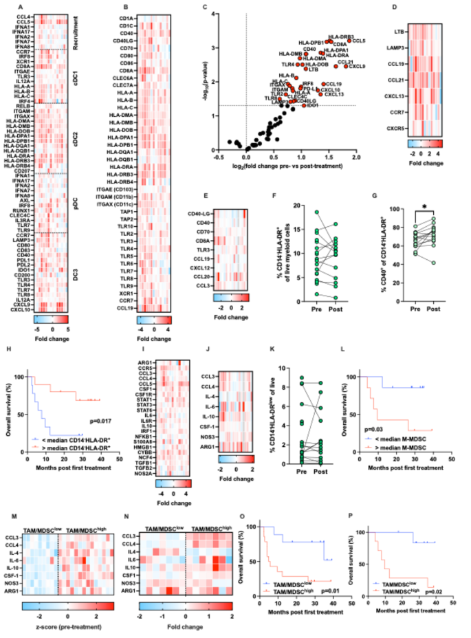 核心成果提炼如下:第一,治疗诱导的树突状细胞/抗原提呈/T细胞相关基因集上调是免疫重编程的核心特征,与既往报道的免疫检查点抑制剂应答特征高度一致,证实该联合方案可有效重塑肿瘤微环境的免疫抑制状态;第二,不良预后生物标志物包括:基线肿瘤相关巨噬细胞/髓系来源抑制细胞相关蛋白水平高(风险比HR>1,P<0.05,Log-rank检验)、治疗后循环髓系来源抑制细胞频率高于中位数(HR>1,P<0.05,Log-rank检验),可用于筛选治疗不获益人群;第三,良好预后生物标志物包括:基线CD56brightCD16-自然杀伤细胞频率高于中位数(HR<1,P<0.05,Log-rank检验)、基线肿瘤MAGE-C1/2高表达(HR<1,P<0.05,Log-rank检验),可用于指导优势人群筛选;第四,治疗后调节性T细胞相关基因上调幅度低的患者总生存期更长(HR<1,P<0.05,Log-rank检验),提示调节性T细胞的抑制效应是影响治疗获益的重要因素。所有统计结果均来自14-17例配对样本的差异检验和生存分析,单个生物标志物的95%置信区间文献未明确提供,仅Cox回归分析显示上述指标与总生存期存在显著关联。
