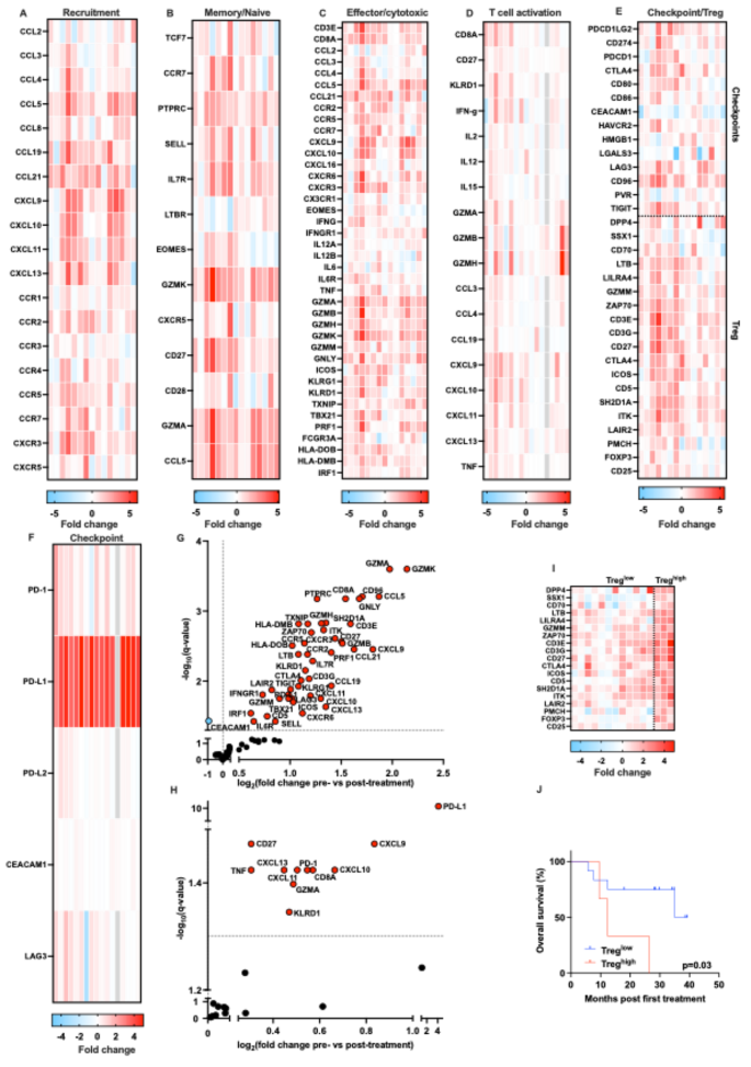 结果显示,治疗后9周和27周,肿瘤微环境中树突状细胞相关基因集(调和平均P值分别为0.00025、0.0015,n=15,P<0.001)、抗原提呈相关基因集(调和平均P值分别为0.00031、0.0025,n=15,P<0.001)、三级淋巴结构(tertiary lymphoid structure,TLS)相关基因集(调和平均P值分别为0.0023、0.0024,n=15,P<0.01)、T细胞募集/记忆/效应相关基因集、自然杀伤细胞相关基因集均显著上调;同时肿瘤相关巨噬细胞(tumor-associated macrophage,TAM)和髓系来源抑制细胞(myeloid-derived suppressor cell,MDSC)相关基因集也显著上调(调和平均P值分别为0.00027、0.0012,n=15,P<0.001);K-means聚类显示调节性T细胞(regulatory T cell,Treg)相关基因上调幅度低的患者总生存期(overall survival,OS)更长(P<0.05,Log-rank检验)。对应结果图为转录组差异基因热图、火山图、生存曲线: