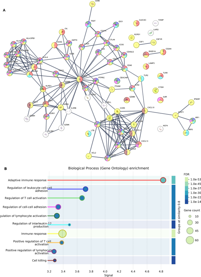 本环节的核心目标是明确治疗诱导的免疫特征与患者预后的关联,解析核心调控通路。实验采用单变量Cox回归分析肿瘤微环境基因表达、外周免疫细胞频率与总生存期的关联,采用STRING数据库进行基因本体(gene ontology,GO)富集分析和通路互作分析。