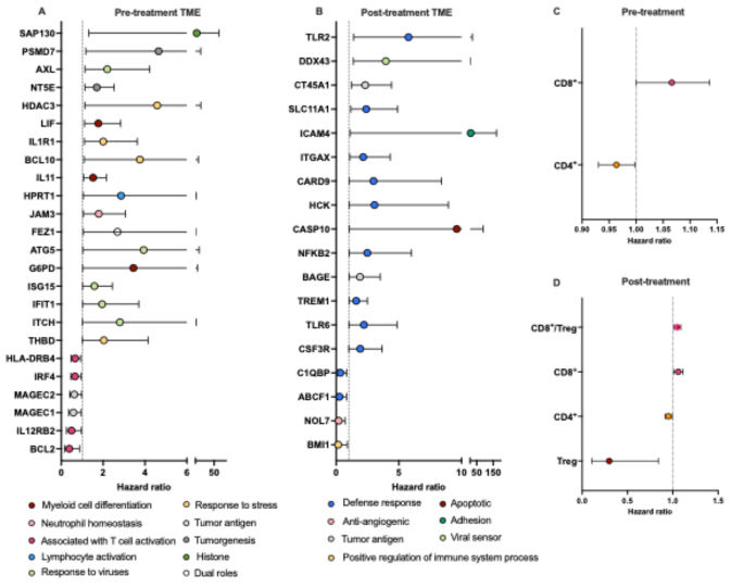 结果显示,通路分析显示CD8A是治疗诱导的免疫基因网络的核心节点,与MHC分子、细胞因子/趋化因子、T细胞活化和杀伤相关基因高度相关;基线肿瘤微环境中黑色素瘤抗原MAGE-C1/2、T细胞活化相关基因IRF4、HLA-DRB4高表达的患者总生存期更长,治疗后T细胞适应度相关基因BMI1、C1QBP高表达的患者总生存期更长;而抗病毒防御相关基因高表达的患者总生存期更短;外周血中基线CD4+T细胞、调节性T细胞频率高的患者总生存期更长,而CD8+T细胞频率高的患者总生存期更短,推测:该现象与CD8+T细胞向肿瘤微环境浸润导致外周消耗有关。对应结果图为通路互作网络、森林图: