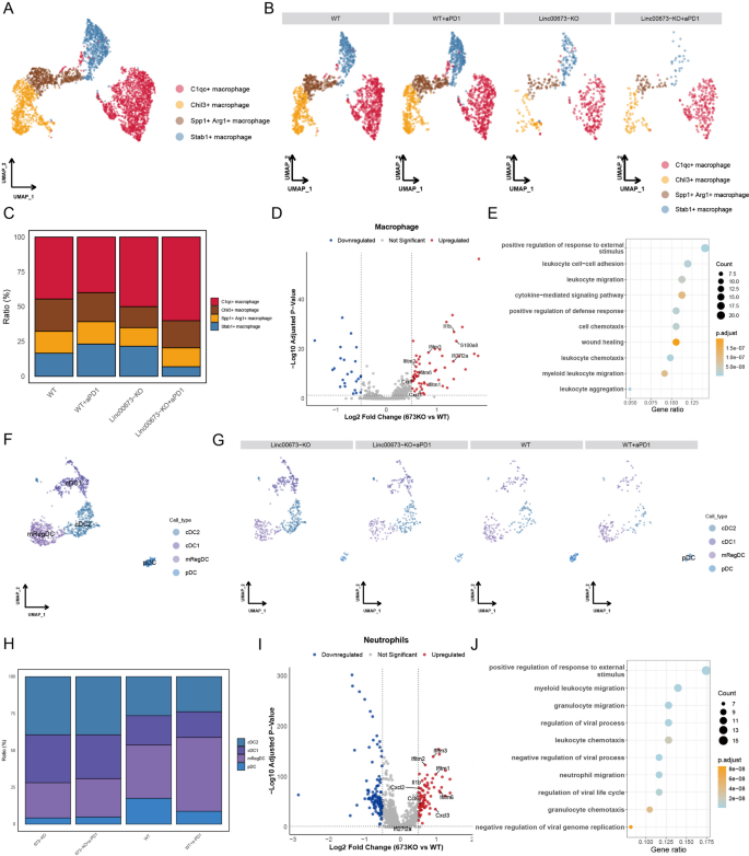 B细胞的总数量在Linc00673敲除组显著升高(野生型组206个,敲除组3420个,敲除+程序性死亡受体1组5566个),其中绝大多数为激活型B细胞,差异基因富集于RNA剪接、核糖体生物发生、翻译调控等与B细胞激活、抗体产生相关的通路。巨噬细胞可分为4个亚群:C1qc+促炎型巨噬细胞、Stab1+免疫抑制型巨噬细胞、Spp1+Arg1+免疫抑制型巨噬细胞、Chil3+巨噬细胞;与野生型组相比,Linc00673敲除组中免疫抑制型的Spp1+Arg1+、Stab1+巨噬细胞比例显著降低,C1qc+促炎型巨噬细胞比例显著升高;差异基因分析显示敲除组巨噬细胞中Il1b、Ifitm3、Cxcl3等促炎基因显著上调,基因本体富集于免疫反应正调控、白细胞迁移、细胞趋化等通路。树突状细胞可分为4个亚群:经典1型树突状细胞(cDC1)、经典2型树突状细胞(cDC2)、浆细胞样树突状细胞(pDC)、调节性树突状细胞(mRegDC);敲除组中负责抗原交叉呈递的经典1型树突状细胞、经典2型树突状细胞比例显著升高,免疫抑制性调节性树突状细胞比例显著降低。中性粒细胞的差异基因分析显示,敲除组中性粒细胞中干扰素刺激基因(Ifitm1、Ifitm2、Ifitm3)、趋化相关基因(Cxcl2、Cxcl3)显著上调,基因本体富集于粒细胞迁移、炎症反应正调控等通路。产品关联:文献未提及该环节具体实验产品,领域常规使用髓系细胞、B细胞亚群特异性marker抗体。