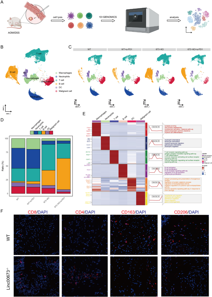 共注释得到6种主要细胞类群:上皮细胞、树突状细胞(DC)、T细胞、B细胞、中性粒细胞、巨噬细胞;与野生型组相比,Linc00673敲除联合程序性死亡受体1阻断组中恶性上皮细胞、巨噬细胞、髓系细胞的比例显著降低,T细胞、B细胞的比例显著升高;免疫荧光染色验证显示,Linc00673敲除组肿瘤组织中CD8+、CD4+T细胞的浸润数量显著增加,M2型巨噬细胞标志物CD163、CD206的表达显著降低,与单细胞测序结果一致。产品关联:实验所用关键产品:10x Genomics的Chromium Next GEM Single Cell 3ʹ Reagent Kits v3,Illumina的NovaSeq 6000测序平台,免疫荧光检测所用一抗、二抗试剂盒品牌货号文献未明确提及,领域常规使用抗CD8、CD4、CD163、CD206特异性一抗及荧光标记二抗。