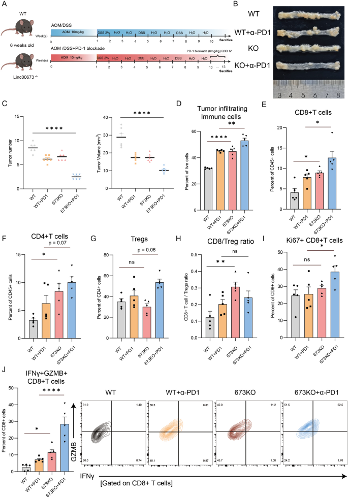 本环节核心目标是在体内验证Linc00673敲除单独及联合程序性死亡受体1阻断的抗肿瘤效果,以及其对肿瘤免疫微环境的调控作用。方法细节:采用CRISPR/Cas9基因编辑技术构建Linc00673全身敲除(KO)小鼠,通过基因型PCR验证敲除成功;采用AOM/DSS诱导构建结肠炎相关结直肠癌模型,6周龄雄性C57BL/6J小鼠随机分为4组:野生型(WT)对照组、野生型+程序性死亡受体1阻断组、Linc00673敲除组、Linc00673敲除+程序性死亡受体1阻断组,每组n=8;造模方案为腹腔注射10mg/kg的偶氮甲烷(AOM),7天后给予2.5%葡聚糖硫酸钠(DSS)饮水7天,随后给予普通饮水14天,上述葡聚糖硫酸钠处理循环重复3次;程序性死亡受体1阻断抗体给药方案为6mg/kg,每3天尾静脉注射一次;实验终点处死小鼠,收集结肠组织,统计肿瘤数量与体积,采用流式细胞术(FCM)检测肿瘤组织中浸润免疫细胞的比例与功能表型。结果解读:动物实验流程与结果如图2所示,