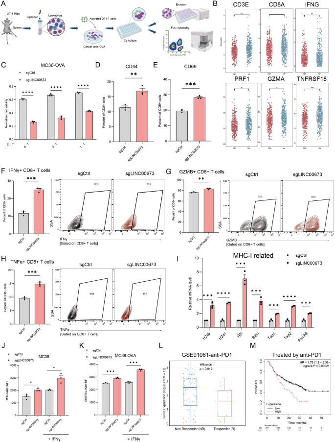 本环节核心目标为体外验证LINC00673对CD8+T细胞细胞毒性的调控作用,及LINC00673表达与免疫检查点抑制剂治疗响应的临床相关性。方法细节:采用CRISPR/Cas9技术构建LINC00673稳定敲除的MC38结肠癌细胞系,通过CCK8实验、Transwell迁移实验、划痕实验检测LINC00673敲除对肿瘤细胞增殖、迁移能力的影响;构建MC38皮下荷瘤模型(雌性C57BL/6小鼠,每组n=6),监测肿瘤生长,实验终点采用流式细胞术检测肿瘤浸润免疫细胞的表型;构建表达OVA抗原的MC38细胞系,与OT-I转基因小鼠来源的CD8+T细胞共培养,检测CD8+T细胞的激活标志物、效应分子表达及肿瘤细胞杀伤效率;通过实时荧光定量PCR、流式细胞术检测LINC00673敲除对肿瘤细胞MHC-I抗原呈递通路的影响;分析癌症基因组图谱结直肠癌数据集、接受免疫检查点抑制剂治疗的公共患者队列中LINC00673表达与免疫激活特征、治疗响应、预后的相关性。结果解读:体外功能实验与临床相关性分析结果如图7、8所示,