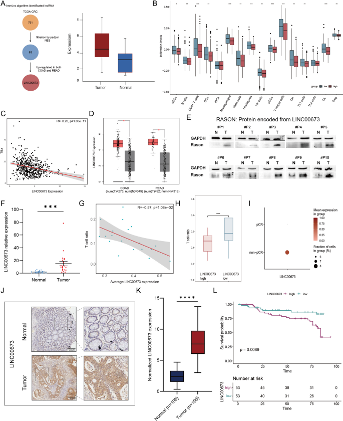 癌症基因组图谱数据集的单样本基因集富集分析(ssGSEA)显示,LINC00673高表达的结直肠癌样本中CD8+T细胞、肿瘤浸润淋巴细胞(TIL)的富集评分显著降低;相关性分析显示LINC00673表达水平与肿瘤浸润淋巴细胞浸润丰度呈显著负相关(R=-0.21,P<0.001);基因表达谱交互分析2数据库验证显示LINC00673在结肠癌和直肠癌组织中的表达均显著高于癌旁组织;临床样本验证结果显示,结直肠癌组织中LINC00673的蛋白和RNA水平均显著高于癌旁组织,其中RNA表达量为癌旁组织的2.7倍(n=20,P<0.001);公共单细胞测序数据分析显示,LINC00673表达与总T细胞浸润、CD8+T细胞数量呈显著负相关,且在未获得病理完全缓解(non-pCR)的患者中表达显著高于病理完全缓解患者(病理完全缓解组n=15,非病理完全缓解组n=4,P<0.05);免疫组化染色显示LINC00673主要表达于肿瘤细胞胞质中,肿瘤组织的免疫组化染色评分显著高于癌旁组织(n=53对,P<0.001);Kaplan-Meier生存分析显示,LINC00673高表达患者的总生存期显著短于低表达患者(log-rank P=0.0089)。产品关联:文献未提及该环节具体实验产品的品牌及货号,领域常规使用RNA提取试剂盒、实时荧光定量PCR试剂、免疫组化检测试剂盒、LINC00673特异性一抗及对应二抗等。