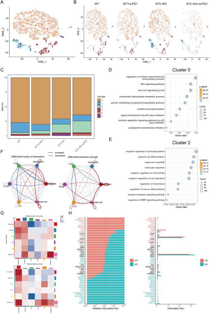 恶性上皮细胞共分为6个亚群,其中Cluster 0富集于Wnt信号通路、氧化磷酸化、核苷生物合成等促癌通路,其在Linc00673敲除组中的比例显著降低;Cluster 2富集于磷酸化负调控、髓系细胞分化、白细胞迁移等通路,其在敲除组中的比例显著升高。细胞间互作分析显示,与野生型组相比,Linc00673敲除组中T细胞与恶性细胞的互作数量和强度均显著升高,MHC-I介导的信号通路互作显著增强,而免疫抑制性巨噬细胞与恶性细胞的互作显著降低。产品关联:文献未提及该环节具体实验产品,领域常规使用拷贝数变异分析工具、细胞间互作分析相关R包。