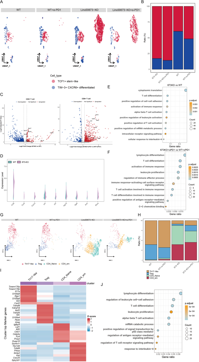 CD8+T细胞可分为两个功能亚群:TCF1+干细胞样CD8+T细胞、TIM-3+CXCR6+分化型CD8+T细胞;野生型组中分化型T细胞占比更高,而Linc00673敲除组中干细胞样T细胞的占比显著升高,联合程序性死亡受体1阻断后可促进干细胞样T细胞向效应细胞分化;差异基因分析显示,与野生型组相比,Linc00673敲除组的CD8+T细胞中翻译相关基因、T细胞激活相关基因(Rps24、Il6ra、Ccr7等)显著上调,联合程序性死亡受体1阻断后细胞毒性相关基因(Gzma、Gzmb、Il2ra等)进一步上调;小提琴图显示敲除组CD8+T细胞中Ccl5、Cxcr3、Irf1、Prf1等效应功能相关基因的表达显著升高;基因本体富集分析显示,敲除组CD8+T细胞富集于细胞质翻译、T细胞分化、αβT细胞激活等通路,联合程序性死亡受体1阻断后富集于免疫反应激活、白细胞增殖、免疫效应过程调控等通路。CD4+T细胞可分为初始T细胞、效应记忆T细胞、调节性T细胞、Th17样细胞4个亚群,Linc00673敲除组中免疫抑制性调节性T细胞的比例显著降低,效应记忆T细胞、Th17样细胞的比例显著升高;基因本体富集分析显示敲除组CD4+T细胞富集于淋巴细胞分化、T细胞激活、白细胞增殖等通路。产品关联:文献未提及该环节具体实验产品,领域常规使用T细胞亚群特异性marker抗体、单细胞测序数据分析相关R包。