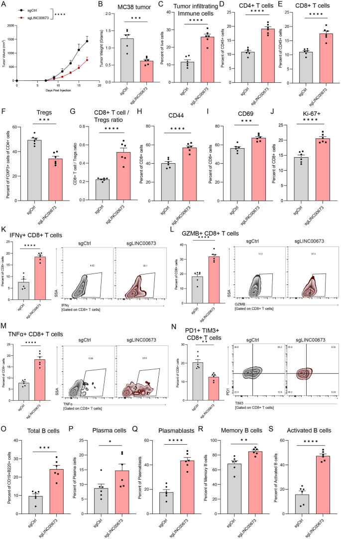 LINC00673敲除不影响MC38细胞的体外增殖,但可诱导G1期细胞周期阻滞、细胞凋亡增加,细胞迁移、侵袭能力显著降低。皮下荷瘤模型结果显示,LINC00673敲除组的肿瘤生长速率显著低于对照组,第21天的肿瘤体积较对照组减少65%(n=6,P<0.001);流式细胞术显示敲除组肿瘤中CD8+T细胞的浸润比例、激活标志物(CD44、CD69)表达、增殖标志物Ki67表达、效应分子(干扰素-γ、颗粒酶B、肿瘤坏死因子-α(TNF-α))表达均显著升高,PD-1+TIM-3+耗竭型CD8+T细胞比例显著降低;同时B细胞总数量、激活型B细胞、浆细胞、记忆B细胞的比例均显著升高。体外共培养实验显示,在不同效应靶比(E:T)下,LINC00673敲除组的肿瘤细胞杀伤率均显著高于对照组,E:T=10:1时杀伤率升高42%(n=3,P<0.01);CD8+T细胞的CD44、CD69表达升高1.7-1.9倍(n=3,P<0.01),干扰素-γ、颗粒酶B、肿瘤坏死因子-α表达分别升高2.1倍、2.3倍、1.8倍(n=3,P<0.001)。机制验证显示,LINC00673敲除的MC38细胞中MHC-I通路相关基因(H2-D1、H2-Kb、B2m、Tap1、Tap2等)的mRNA表达显著上调1.5-3.2倍(n=3,P<0.05-0.001),细胞表面MHC-I分子、抗原肽-MHC-I复合物的平均荧光强度显著升高。临床队列分析显示,接受免疫检查点抑制剂治疗的患者中,LINC00673低表达组的治疗响应率显著高于高表达组,总生存期显著更长(风险比HR=1.76,log-rank P=0.00021)。产品关联:实验所用关键产品:STEMCELL公司的EasySep小鼠CD8+T细胞分离试剂盒,BioLegend的流式细胞术相关抗体(CD45、CD3ε、CD4、CD8a、干扰素-γ、颗粒酶B等,货号文献未明确提及)。
