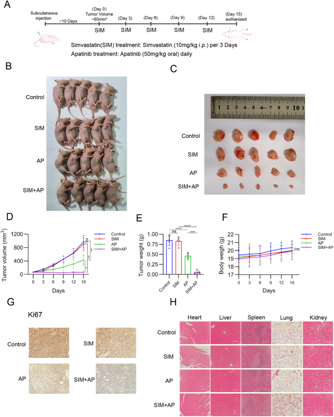 实验目的:验证辛伐他汀联合阿帕替尼在裸鼠移植瘤模型中的抗肿瘤效果和安全性。