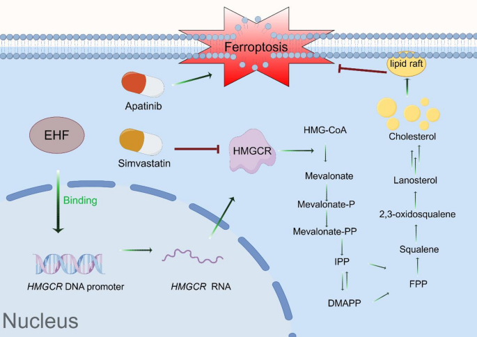 本研究的整体调控机制如下:阿帕替尼耐药细胞中EHF表达上调,通过直接结合HMGCR启动子促进其转录,增加胆固醇合成,进而抑制阿帕替尼诱导的铁死亡,介导耐药;辛伐他汀通过抑制HMGCR减少胆固醇合成,可恢复耐药细胞对阿帕替尼诱导铁死亡的敏感性,发挥增敏作用。机制示意图如下: