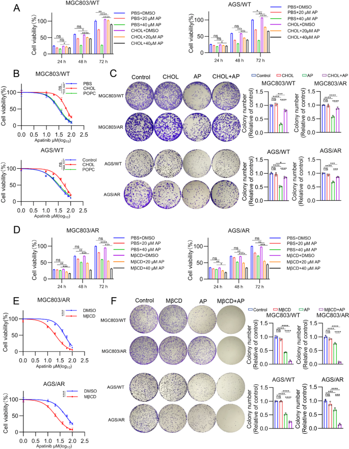 结果解读:外源性补充5mg/mL胆固醇后,MGC803/WT和AGS/WT细胞在20μM阿帕替尼处理48小时后的活力分别升高1.5倍和1.4倍(n=3,P<0.01),克隆形成数量增加1.4倍和1.3倍(n=3,P<0.05);而3mM MβCD处理1小时消耗胆固醇后,MGC803/AR和AGS/AR细胞在20μM阿帕替尼处理48小时后的活力分别下降42%和47%(n=3,P<0.001),克隆形成数量减少61%和58%(n=3,P<0.001);POPC处理未改变细胞对阿帕替尼的敏感性,证实胆固醇是介导耐药的特异性分子。对应的实验结果图如下: