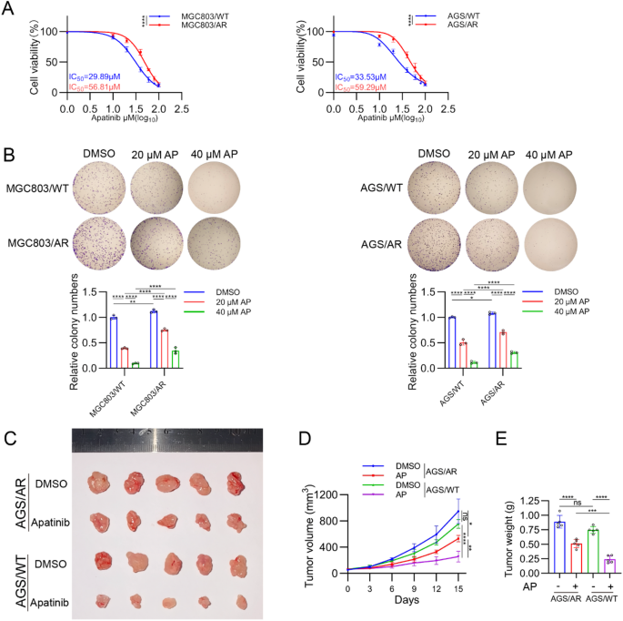 方法细节:采用逐步升高阿帕替尼浓度诱导的方式,分别在MGC803和AGS胃癌亲本细胞系基础上构建耐药细胞系MGC803/AR和AGS/AR,维持阶段将细胞培养在含50μM阿帕替尼的培养基中,实验前撤去阿帕替尼培养7天以排除药物的直接影响。通过CCK-8实验检测不同浓度阿帕替尼处理后的细胞活力,克隆形成实验检测细胞的增殖能力,同时构建BALB/c裸鼠皮下移植瘤模型,验证体内耐药性。