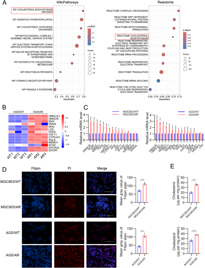 方法细节:对AGS/AR和AGS/WT细胞进行RNA测序,采用EdgeR软件进行差异表达分析,使用基因集富集分析(GSEA)对差异基因进行通路富集;通过实时荧光定量PCR(qRT‒PCR)验证胆固醇合成通路关键基因的mRNA表达水平;采用菲律宾菌素(Filipin)荧光染色和总胆固醇检测试剂盒,分别定性和定量检测细胞内的胆固醇含量。