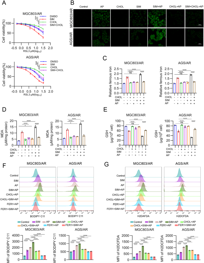 结果解读:耐药细胞对RSL3的IC50为亲本细胞的2.3倍(n=3,P<0.01),提示耐药细胞存在铁死亡抵抗;5μM辛伐他汀处理或HMGCR敲低后,MGC803/AR细胞在20μM阿帕替尼处理后的脂质过氧化水平升高2.1倍(n=3,P<0.001),MDA含量升高1.7倍(n=3,P<0.01),GSH含量下降38%(n=3,P<0.01),亚铁离子含量升高1.5倍(n=3,P<0.05);流式细胞术结果显示,联合用药组的脂质活性氧水平较阿帕替尼单药组升高2.4倍(n=3,P<0.001);外源性补充胆固醇或Ferrostatin-1处理可完全逆转上述效应,证实胆固醇通过抑制铁死亡介导阿帕替尼耐药。对应的实验结果图如下: