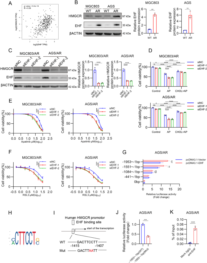 结果解读:GEPIA数据库的TCGA胃癌队列分析显示,胃癌组织中EHF与HMGCR的表达呈显著正相关(相关系数r=0.42,P<0.001);蛋白质印迹结果显示,耐药细胞中EHF的蛋白表达为亲本细胞的2.2倍(n=3,P<0.01);EHF敲低可使耐药细胞中HMGCR的蛋白表达下降53%(n=3,P<0.01),细胞对阿帕替尼和RSL3的敏感性分别恢复1.6倍和1.8倍(n=3,P<0.01);双荧光素酶报告实验显示,EHF可结合HMGCR启动子的-1953bp至-1084bp区域,突变预测的EHF结合位点(-1415bp至-1407bp)后,荧光素酶活性下降62%(n=3,P<0.001);ChIP实验证实EHF可直接结合该区域(富集倍数=4.7,n=4,P<0.001)。对应的实验结果图如下: