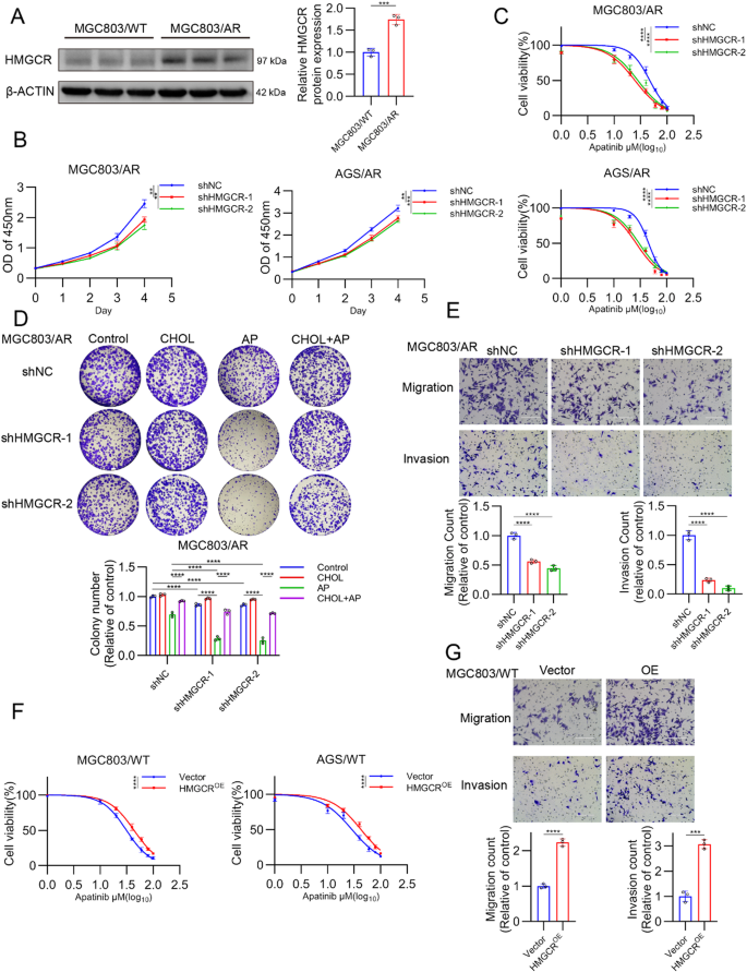 方法细节:通过慢病毒转导构建HMGCR稳定敲低和过表达细胞系,采用蛋白质印迹(Western blot)验证敲低/过表达效率;通过CCK-8实验、克隆形成实验、Transwell实验分别检测细胞增殖、阿帕替尼敏感性、迁移和侵袭能力的变化;使用不同浓度的辛伐他汀处理耐药细胞,检测细胞内胆固醇水平和阿帕替尼敏感性的变化,同时补充外源性胆固醇验证HMGCR的特异性作用。