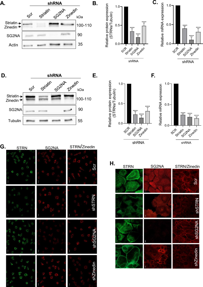 本环节的核心目标是构建纹蛋白家族三个成员稳定敲低的成纤维细胞和角质形成细胞模型,确保后续实验的可靠性。实验采用慢病毒介导的shRNA技术,针对三个纹蛋白家族基因共设计14条shRNA序列,克隆至慢病毒载体后感染细胞,经3μg/ml嘌呤霉素筛选1周获得稳定细胞株,后续通过蛋白质免疫印迹(Western blot)、实时荧光定量PCR(qPCR)、免疫荧光实验验证敲低效率,筛选出敲低效果最显著的shRNA序列(shSTR-79、shSG2NA-17、shZinedin-68)用于后续实验。