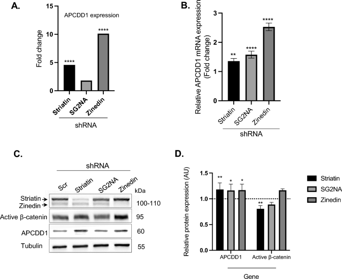 本环节的核心目标是验证纹蛋白家族对Wnt信号通路的调控作用,明确其与既往报道的纹蛋白-APC互作的功能关联。实验首先分析RNA测序数据中Wnt通路相关基因的表达变化,通过实时荧光定量PCR和蛋白质免疫印迹检测Wnt通路抑制剂APCDD1和活性β-连环蛋白的表达水平;同时在稳定表达Wnt3A的成纤维细胞中过表达APCDD1,验证其对Wnt通路的抑制作用。