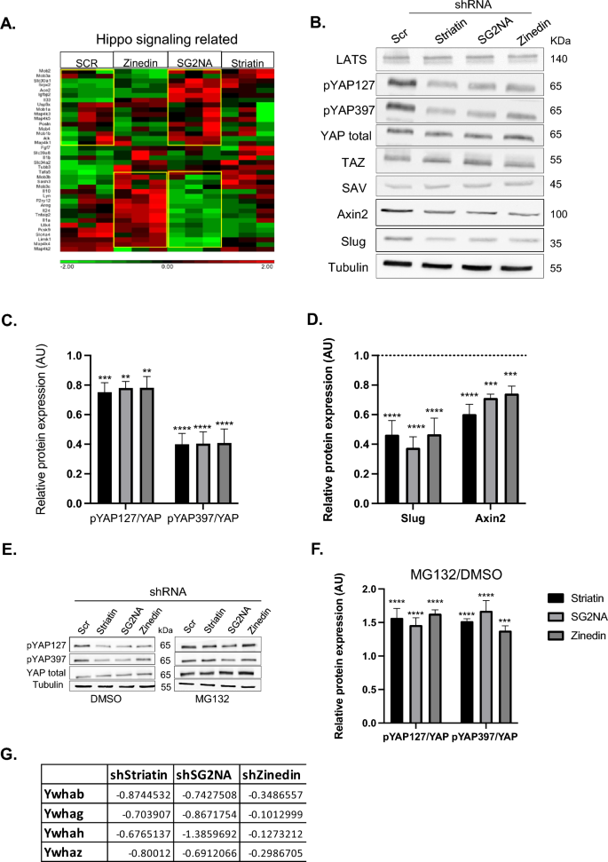 实验结果显示,纹蛋白敲低后总YAP水平无显著变化,但pYAP S127和pYAP S397的水平均显著下降(n=3,P<0.001),Hippo靶基因Axin2、Slug的mRNA表达也显著下调(n=3,P<0.05),提示纹蛋白调控Hippo通路不影响YAP的总表达,而是影响其磷酸化形式的稳定性;使用MG132抑制蛋白酶体活性后,pYAP的水平显著恢复,提示纹蛋白可保护pYAP免受蛋白酶体降解;质谱分析显示,STRN1或SG2NA敲低后14-3-3蛋白家族的表达下降,该蛋白可结合pYAP S127使其滞留在细胞质中,其表达下降可能促进pYAP的暴露和降解;进一步的泛素化检测实验显示,纹蛋白敲低后YAP的泛素化水平未发生变化,提示pYAP的降解可能通过泛素非依赖的蛋白酶体降解途径介导。
