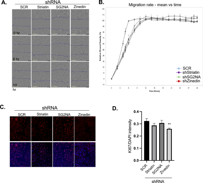 本环节的核心目标是验证纹蛋白家族对细胞迁移和增殖的调控作用,明确其生物学功能效应。实验采用自动化伤口愈合实验检测细胞迁移能力,细胞接种至96孔板培养至汇合后,使用伤口制作仪制备划痕,每2小时拍摄图像持续24小时,通过Incucyte软件分析伤口闭合率;采用Ki-67免疫荧光染色检测细胞增殖水平,使用共聚焦显微镜拍摄图像后定量Ki-67阳性细胞比例。