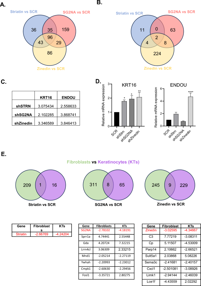 实验结果显示,纹蛋白家族三个成员在成纤维细胞和角质形成细胞中具有独特的表达模式,符合其组织表达特异性的既往报道;转录组分析显示,成纤维细胞中SG2NA敲低后特有差异基因占比约50%(159/319),而角质形成细胞中zinedin敲低后特有差异基因最多(224个),两种细胞中STRN1敲低后无共同差异基因,SG2NA和zinedin敲低后仅存在少量共同差异基因,提示纹蛋白家族的功能具有显著的细胞特异性和成员特异性;实时荧光定量PCR验证显示,角质形成细胞中三个纹蛋白敲低后角蛋白16(KRT16)的mRNA表达均显著上调(n=3~4,P<0.05),与RNA测序结果一致。功能富集分析显示,纹蛋白敲低后角质形成细胞中细胞分化相关通路显著上调,而成纤维细胞中细胞定位、迁移相关通路显著上调,符合两种细胞的功能特性差异。