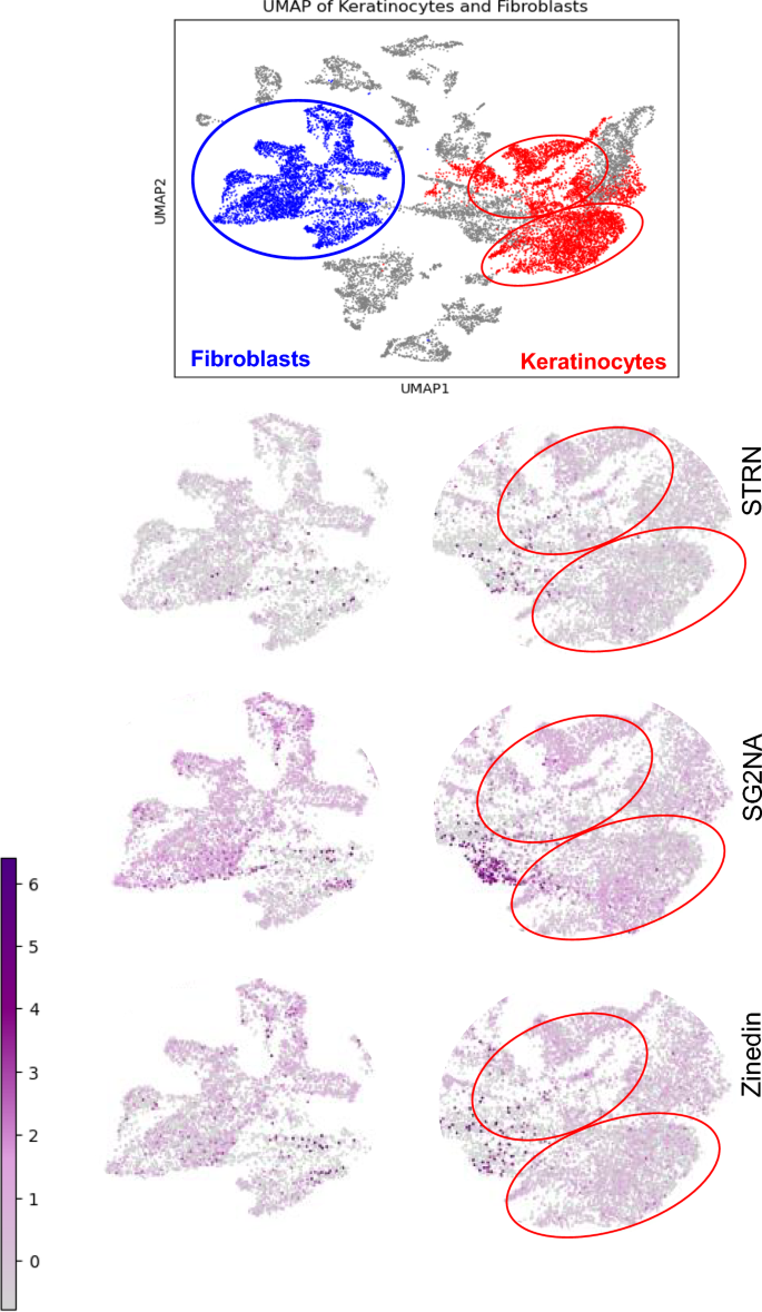 本环节的核心目标是明确纹蛋白家族在不同细胞中的表达特征,以及敲低后基因表达谱的变化,揭示其功能的细胞特异性。实验首先分析GEO数据库中GSE188954的小鼠皮肤单细胞RNA测序数据,通过Scanpy软件进行标准预处理和UMAP聚类,注释成纤维细胞和角质形成细胞簇后分析纹蛋白家族的表达模式;随后对敲低细胞进行RNA测序,采用DAVID、GSEA工具进行差异基因的功能富集分析,通过韦恩图分析差异基因的重叠情况,并用实时荧光定量PCR验证关键差异基因的表达。