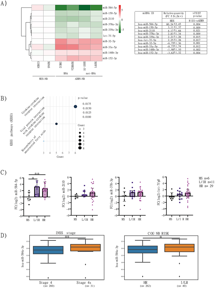本环节的核心目标是筛选间质表型细胞分泌的细胞外囊泡中特异性表达的微小RNA,验证其作为无创液体活检标志物的可行性。实验首先按照细胞外囊泡研究的MISEV2023指南分离鉴定间质和肾上腺素能表型细胞分泌的细胞外囊泡,采用实时荧光定量聚合酶链式反应检测囊泡中的微小RNA表达谱,筛选差异表达的分子;后续收集47例神经母细胞瘤患者的血浆样本,包括6例自发消退亚型、11例中低危、29例高危患者,分离血浆来源的细胞外囊泡,检测候选微小RNA的表达,同时结合TARGET数据集验证其表达与风险分层的关联。结果显示细胞系来源的细胞外囊泡检测结果显示,共有10个微小RNA存在差异表达,其中miR-584a-5p、miR-2110、miR-150-5p、let-7f-5p在间质来源的细胞外囊泡中显著富集(图2A);京都基因与基因组百科全书通路富集结果显示这些囊泡微小RNA的靶基因主要富集于细胞因子-细胞因子受体相互作用、不饱和脂肪酸生物合成等通路(图2B);临床血浆样本验证结果显示,miR-584a-5p在中低危(n=11,P=0.036)和高危(n=29,P=0.005)患者的血浆细胞外囊泡中表达显著高于自发消退亚型患者(图2C);TARGET数据集验证结果显示,miR-584a-3p在中低危患者肿瘤组织中表达显著上调(国际神经母细胞瘤分期系统分层P=0.007,儿童肿瘤学组分层P=0.037)(图2D),符合其潜在的抑癌功能特征。