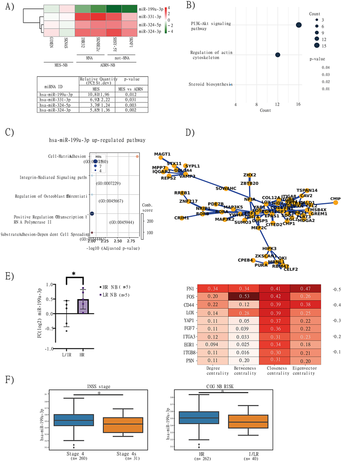 本环节的核心目标是明确miR-199a-3p的靶基因及参与的信号通路,解析其调控间质表型的潜在机制。实验通过生物信息学方法预测miR-199a-3p的靶基因,结合TARGET神经母细胞瘤数据集的高危患者样本数据,对靶基因进行京都基因与基因组百科全书(KEGG)通路富集分析、基因本体(GO)功能富集分析,同时采用STRING数据库进行蛋白-蛋白相互作用网络分析,筛选核心调控基因。结果显示京都基因与基因组百科全书通路富集结果显示miR-199a-3p的靶基因主要富集于细胞黏附、整合素信号、转录调控等间质表型相关通路(图1B、1C);蛋白-蛋白相互作用网络分析显示FN1、CD44、YAP1是核心调控枢纽基因,三者均已被证实与间质表型和不良预后密切相关(图1D)。实验所用关键产品:文献未提及具体实验产品,领域常规使用R语言生物信息学分析包、STRING在线数据库进行相关分析。