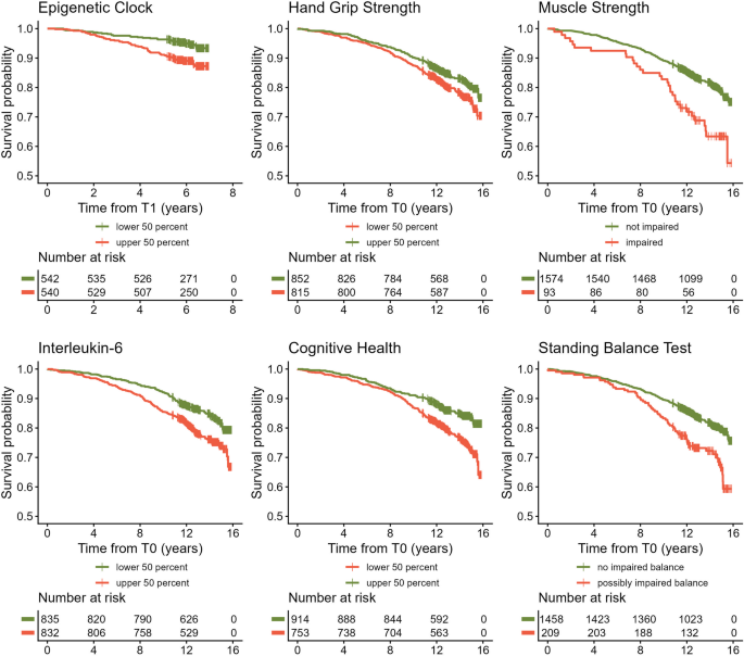 结果解读:在完全校正的模型2中,手握力、白细胞介素6、站立平衡测试评分、认知健康评分、达尼丁衰老速率共5种标志物与全因死亡率存在统计学显著关联(P<0.05,n=1671),其中达尼丁衰老速率的关联强度最高,效应量优于所有功能类及炎症类标志物。其余9种标志物(C反应蛋白、步速、胰岛素样生长因子1、血压、肌肉量、DNA甲基化衍生生长分化因子15、衰弱表型、计时起立行走测试)在完全校正模型中与全因死亡率无统计学显著关联(P>0.05,n=1671)。死因分层亚组分析显示,达尼丁衰老速率与白细胞介素6在所有死因亚组中均保持统计学显著关联(P<0.05,n=180),其余功能类标志物的关联仅存在于循环系统疾病死亡亚组。各标志物的关联效应量森林图如图2所示,核心阳性标志物的Kaplan-Meier生存曲线如图3所示: