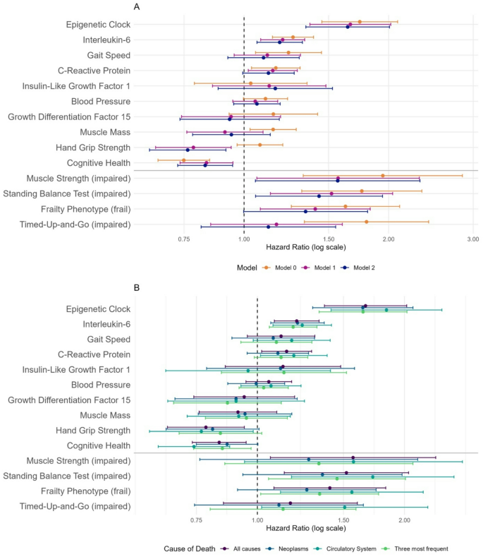 方法细节:采用Cox比例风险回归模型,设置三个递进的校正模型:模型0为未校正的粗模型,模型1校正年龄、性别两个核心混杂因素,模型2额外校正酒精摄入量、吸烟包年数、体力活动水平、遗传祖先四个混杂因素;同时进行死因分层亚组分析,分别评估标志物对肿瘤、循环系统疾病、神经系统疾病三类主要死因的预测效能,采用竞争风险模型处理死因间的竞争事件。所有分析结果经多重插补数据集合并得到最终效应量。