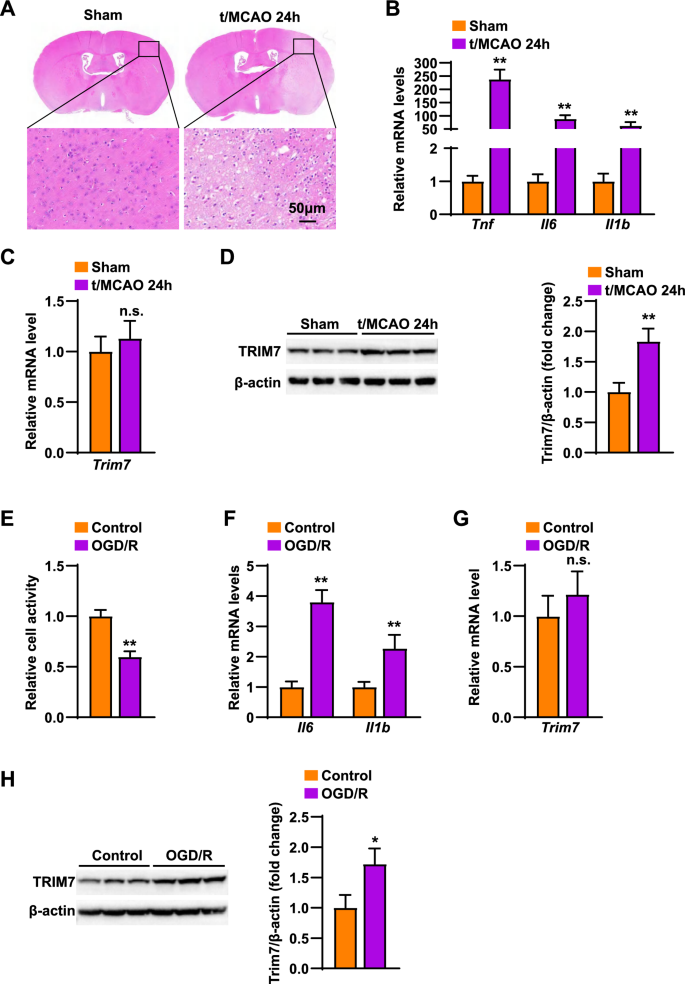 实验目的为明确缺血再灌注损伤后三结构域蛋白7的表达变化规律。方法细节为采用C57BL/6小鼠构建短暂性大脑中动脉闭塞再灌注模型,缺血45分钟后再灌注24小时收集脑组织;分离大鼠原代皮质神经元,构建氧糖剥夺/复氧模型,缺氧3小时后复氧6小时;采用苏木精-伊红(HE)染色评估脑损伤程度,定量实时聚合酶链反应(qRT-PCR)检测三结构域蛋白7 mRNA水平,蛋白免疫印迹(WB)检测三结构域蛋白7蛋白水平,细胞计数试剂盒8(CCK-8)检测神经元活力。结果解读显示,短暂性大脑中动脉闭塞再灌注模型小鼠皮层出现明显神经元水肿、结构紊乱,炎症因子肿瘤坏死因子-α、白细胞介素-6、白细胞介素-1β mRNA水平显著升高(n=4,P<0.01);三结构域蛋白7 mRNA水平无显著变化(n=4,P>0.05),但蛋白水平显著上调(n=3,P<0.05)。氧糖剥夺/复氧处理后神经元活力显著降低(n=4,P<0.01),炎症因子mRNA水平升高(n=4,P<0.01),同样出现三结构域蛋白7蛋白上调而mRNA无变化的现象。对应结果图为图1,