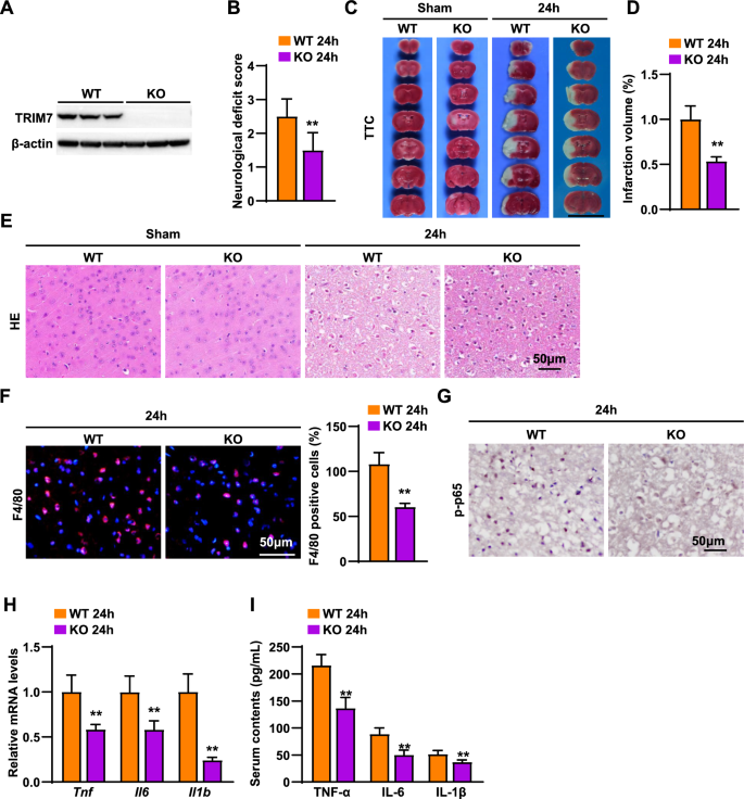 实验目的为验证三结构域蛋白7缺失对缺血再灌注脑损伤的保护作用。方法细节为采用三结构域蛋白7全身敲除小鼠及同窝野生型小鼠构建短暂性大脑中动脉闭塞再灌注模型,再灌注24小时后进行神经功能评分,2,3,5-氯化三苯基四氮唑(TTC)染色检测脑梗死体积,苏木精-伊红染色评估病理损伤,免疫荧光检测F4/80阳性炎症细胞浸润,免疫组化(IHC)检测磷酸化p65表达,定量实时聚合酶链反应和酶联免疫吸附实验(ELISA)分别检测脑组织和血清中炎症因子水平。结果解读显示,三结构域蛋白7敲除小鼠脑组织无三结构域蛋白7蛋白表达(n=3,P<0.01);与野生型短暂性大脑中动脉闭塞再灌注组相比,三结构域蛋白7敲除组神经功能评分显著降低(n=12,P<0.01),脑梗死体积减少(n=6,P<0.01),神经元病理损伤减轻,F4/80阳性细胞浸润减少(n=4,P<0.01),磷酸化p65表达降低(n=4,P<0.01),脑组织和血清中肿瘤坏死因子-α、白细胞介素-6、白细胞介素-1β水平均显著降低(n=4/6,P<0.01)。对应结果图为图2,