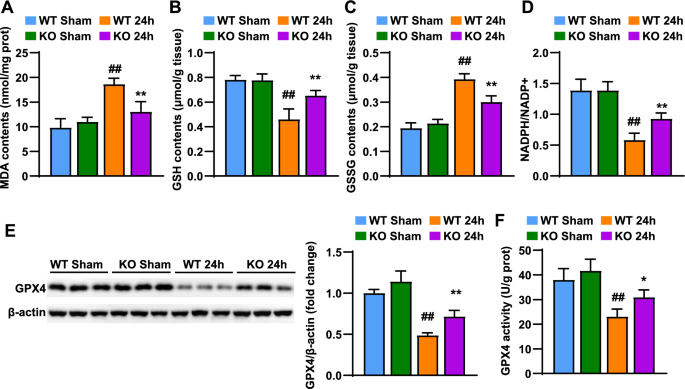 产品关联为文献提及实验所用关键产品:丙二醛检测试剂盒(Beyotime,货号S0131)、还原型谷胱甘肽/氧化型谷胱甘肽检测试剂盒(Beyotime,货号S0053)、烟酰胺腺嘌呤二核苷酸磷酸/氧化型烟酰胺腺嘌呤二核苷酸磷酸检测试剂盒(Beyotime,货号S0180)、谷胱甘肽过氧化物酶4活性检测试剂盒(Elabscience,货号E-BC-K883-M)、Ferrostatin-1(MCE,货号HY-1005791)。