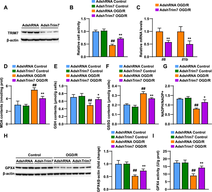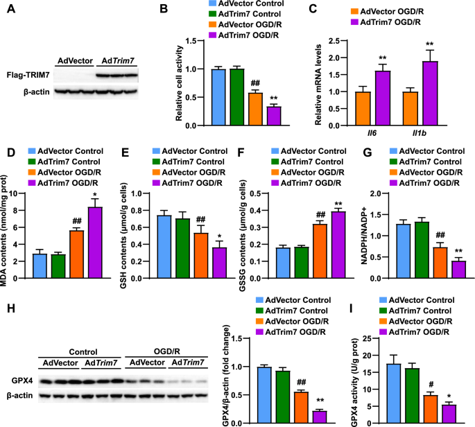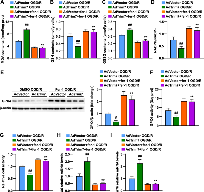 实验目的为明确三结构域蛋白7对缺血再灌注诱导的铁死亡的调控功能。方法细节为在短暂性大脑中动脉闭塞再灌注小鼠模型中,检测脑组织中丙二醛(MDA)、还原型谷胱甘肽(GSH)、氧化型谷胱甘肽(GSSG)水平,烟酰胺腺嘌呤二核苷酸磷酸/氧化型烟酰胺腺嘌呤二核苷酸磷酸(NADPH/NADP+)比值,以及谷胱甘肽过氧化物酶4的蛋白水平和酶活性;在原代神经元氧糖剥夺/复氧模型中,通过腺病毒介导三结构域蛋白7敲低或过表达,检测上述铁死亡相关指标,同时采用铁死亡抑制剂Ferrostatin-1处理进行功能验证。结果解读显示,短暂性大脑中动脉闭塞再灌注模型小鼠脑组织中丙二醛水平显著升高,还原型谷胱甘肽水平降低、氧化型谷胱甘肽水平升高,烟酰胺腺嘌呤二核苷酸磷酸/氧化型烟酰胺腺嘌呤二核苷酸磷酸比值降低,谷胱甘肽过氧化物酶4蛋白水平和酶活性显著下降;三结构域蛋白7敲除可显著逆转上述变化(n=3/6,P<0.05或P<0.01)。细胞实验中,三结构域蛋白7敲低可减轻氧糖剥夺/复氧诱导的神经元活力下降(n=4,P<0.01),降低丙二醛和氧化型谷胱甘肽水平,升高还原型谷胱甘肽水平和烟酰胺腺嘌呤二核苷酸磷酸/氧化型烟酰胺腺嘌呤二核苷酸磷酸比值,恢复谷胱甘肽过氧化物酶4蛋白水平和酶活性(n=3/4,P<0.05或P<0.01);三结构域蛋白7过表达则进一步加重上述铁死亡相关表型(n=3/4,P<0.05或P<0.01)。Ferrostatin-1处理可逆转三结构域蛋白7过表达诱导的铁死亡加重、细胞活力下降及炎症因子升高(n=3/4,P<0.01)。对应结果图为图3、图4、图5、图6,