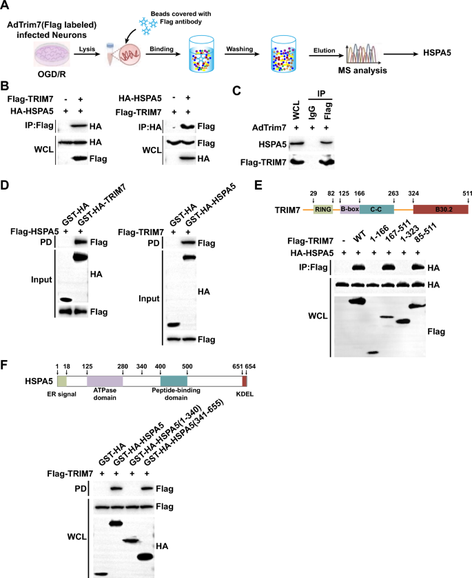 实验目的为鉴定三结构域蛋白7的互作底物,明确二者互作的结构域基础。方法细节为在过表达Flag标签三结构域蛋白7的原代神经元中进行Flag亲和纯化联合质谱分析,筛选潜在互作蛋白;采用免疫共沉淀(Co-IP)、谷胱甘肽S-转移酶拉下(GST pull-down)实验验证三结构域蛋白7与热休克蛋白家族A成员5的互作;构建三结构域蛋白7和热休克蛋白家族A成员5的截短突变体,通过免疫共沉淀和谷胱甘肽S-转移酶拉下实验定位二者互作的结构域。结果解读显示,质谱鉴定到热休克蛋白家族A成员5为三结构域蛋白7的潜在互作蛋白;免疫共沉淀实验证实三结构域蛋白7与热休克蛋白家族A成员5在HEK293T细胞和原代神经元中均存在相互作用,谷胱甘肽S-转移酶拉下实验证实二者为直接互作。结构域定位实验显示三结构域蛋白7的PRY/SPRY结构域(氨基酸324-511)和热休克蛋白家族A成员5的底物结合域(氨基酸341-655)介导了二者的相互作用。对应结果图为图7,