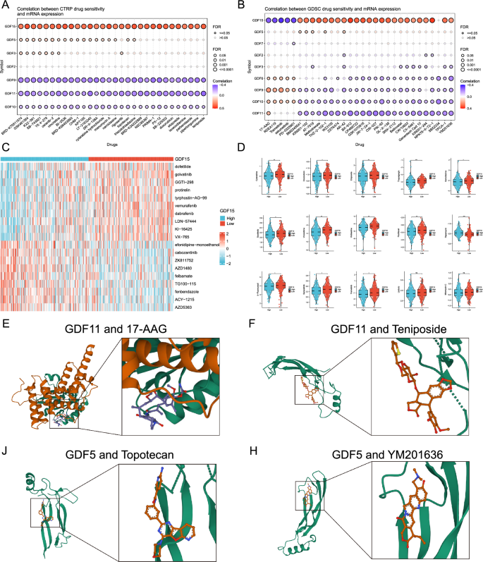 实验目的为筛选生长分化因子亚家族相关的潜在靶向药物,为临床个体化治疗提供参考。方法细节为基于肿瘤药物敏感性基因组学(GDSC)、癌症治疗反应门户(CTRP)、PRISM数据库分析生长分化因子表达与药物敏感性的相关性,采用AutoDockVina进行分子对接验证药物与靶点蛋白的结合能力。结果解读:生长分化因子15高表达与BRD-K70511574、GSK461364等药物的敏感性呈正相关,与17-AAG、曲美替尼等药物的敏感性呈负相关,针对肝细胞癌患者筛选得到多非利特、戈伐替尼等10种与生长分化因子15表达显著相关的潜在药物。分子对接结果显示生长分化因子11与17-AAG、替尼泊苷的结合能均低于-5 kcal/mol,生长分化因子5与拓扑替康、YM201636的结合能均低于-5 kcal/mol,提示上述药物与靶点存在强结合活性(对应图12,