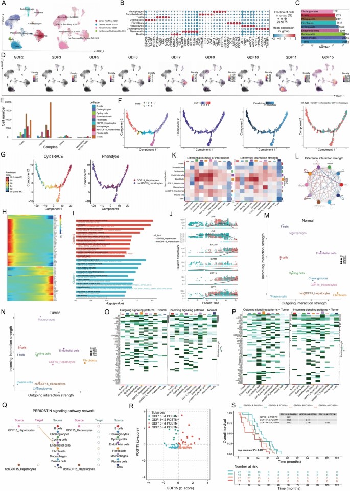 )。细胞互作分析显示,与正常肝组织相比,肿瘤组织中生长分化因子15阳性肝细胞与其他细胞的串扰强度显著升高,癌相关成纤维细胞分泌的骨膜蛋白可通过PERIOSTIN信号通路特异性作用于生长分化因子15阳性肝细胞,二者共表达的肝细胞癌患者总生存期显著更短(风险比HR=2.1,P=0.003)。研究同时在乳腺癌、胰腺癌、结直肠癌等其他癌种中验证了生长分化因子15阳性恶性细胞的低分化特征,以及该细胞亚群与成纤维细胞的强互作模式,且可通过分泌细胞因子调控免疫细胞功能,介导免疫抑制微环境形成(对应图7、图8,