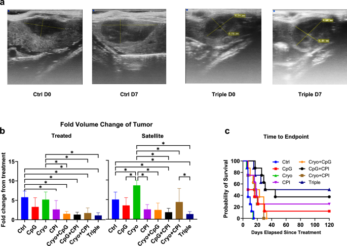 方法细节:冷冻消融采用Galil系统,17G IceSeed探针,实施3次1分钟冷冻(50%功率),实现不完全消融(≤75%肿瘤体积);CpG为100μg CpG-ODN通过超声引导分3次注射至肿瘤消融边缘与肿瘤内;双重CPI为125μg抗PD-1抗体+250μg抗CTLA-4抗体腹腔注射,Day0给药,抗PD-1抗体每3天重复一次,共2周;通过超声每周监测肿瘤体积,计算治疗后1周的肿瘤体积变化倍数;采用Kaplan-Meier法分析小鼠生存期,通过log-rank检验比较组间差异。